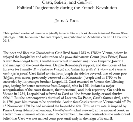 J. Rice publishes in 2016 an updated version of a few pages dedicated to the opera Catilina by Salieri and Casti, written in 1792. Such pages did not appear in his major book Antonio Salieri and Viennese Opera (Chicago, 1998), due to lack of space.