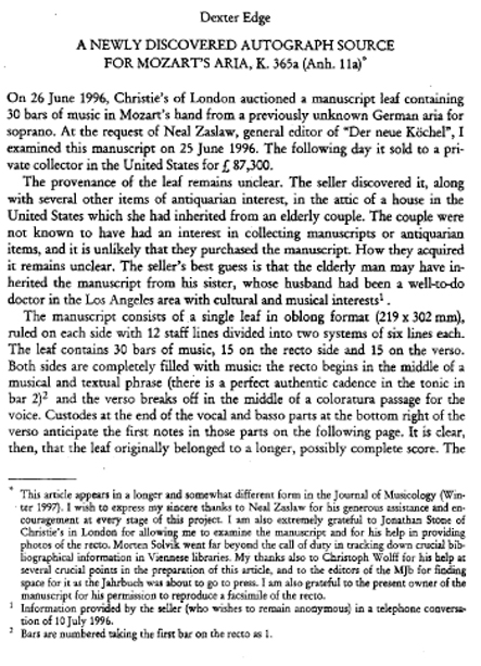 Discovery of a manuscript leaf with 30 bars of unknown soprano aria in Mozart’s hand in the attic of a house in the United States: property of people not particularly interested in antiquarian objects. Origin of the manuscript unclear. It contains a German Aria for Orchestra and Soprano. Facsimile of the manuscript available (p. 179). Apparently written in Munich in ca 1780 for E. Schikaneder for a German version of C. Gozzi’s Le due notti affannose. The aria was known from letters [ie. K. 365a (Anh.11a)], however the music is revealed in the manuscript in question for the first time. There is no trace of the recitative section. Transcription of the Aria at the end of the article (pp. 194-196). Detailed history of the commission and the first performance of this Aria (1 December 1780). Probably this manuscript leaf was property of E. Schikaneder.